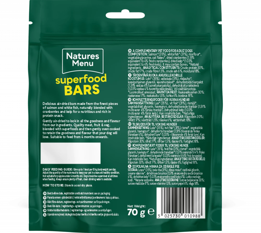 (Old SKU: CHTSWF) Super snacks for your super dog! Only 7 delicious ingredients go into our naturally nutritious, rich-in-protein superfood bars. We’ve chosen the finest pieces of salmon and white fish and blended them with wholesome cranberries and kelp, for a moreish umami flavour.