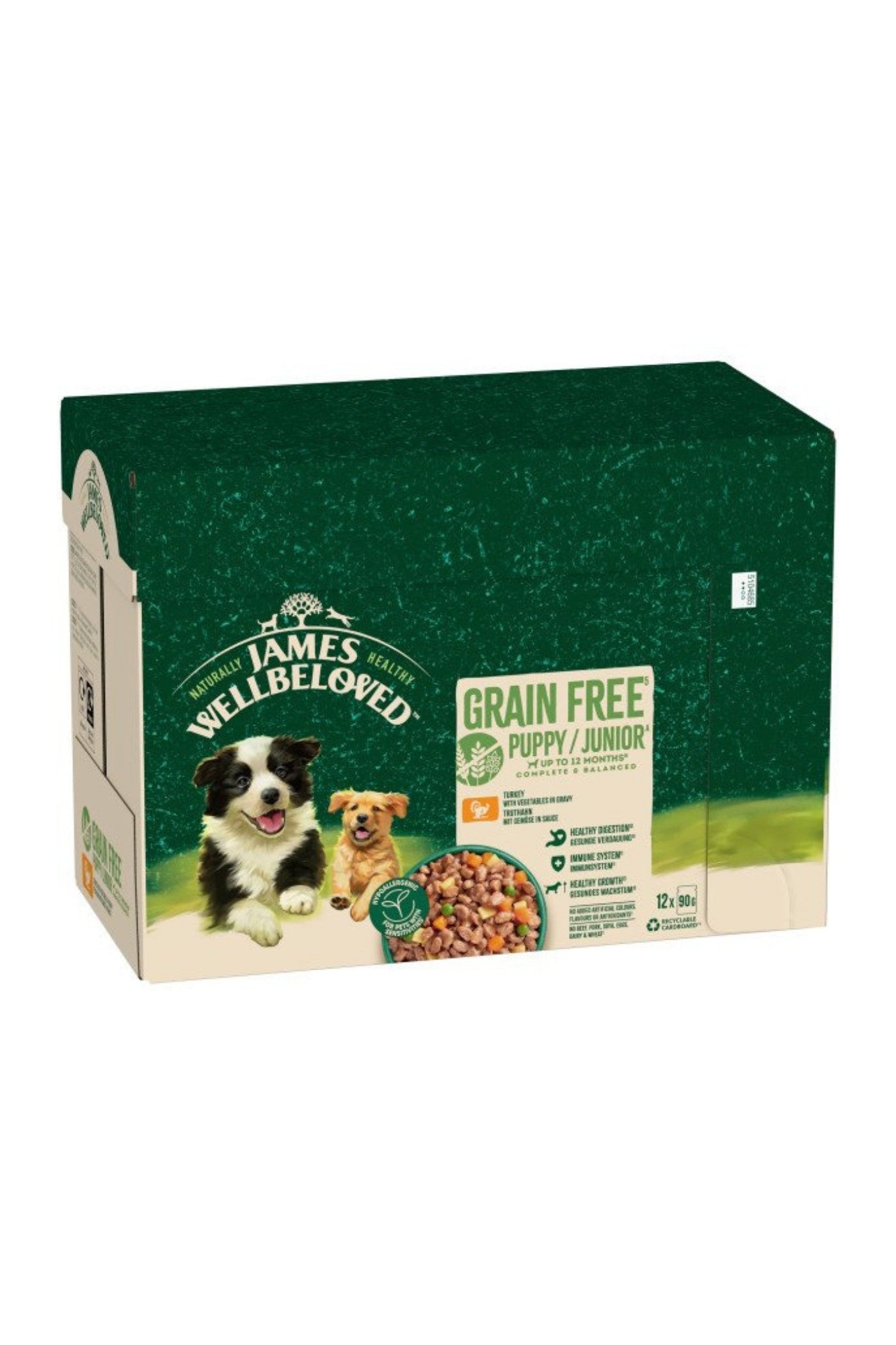 OUR RECIPE FOR HEALTHY LIVING James Wellbeloved Grain Free Turkey puppy food in gravy is crafted using a wholesome recipe your pet will love. Using only simple, natural ingredients, our wet dog food has all the goodness they need and nothing they don't. Our hypoallergenic dog foods are made without common allergens for pets with sensitive tummies.