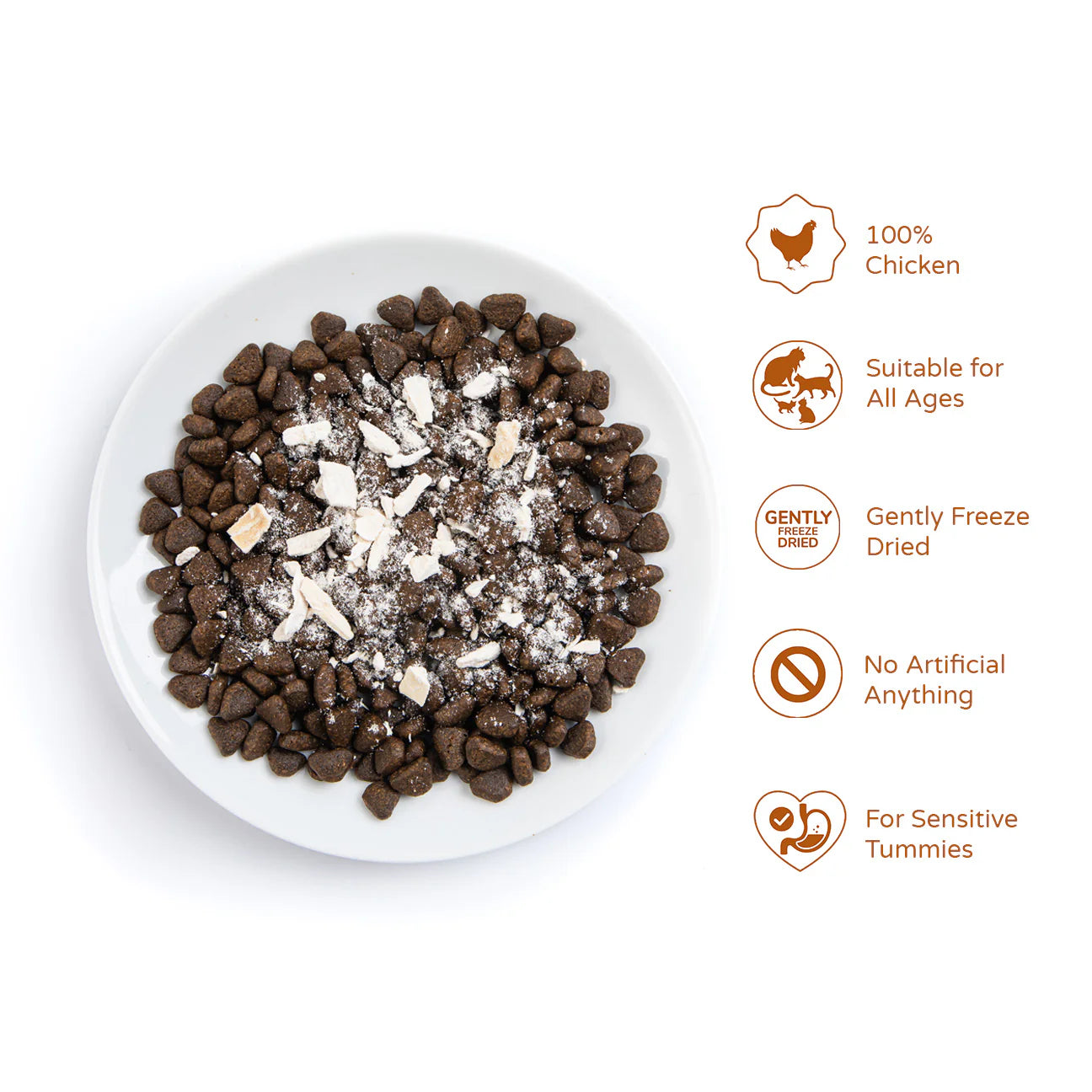 While medicated diets can be essential for health, we know that they can lack the excitement of flavour, so cats often need a little extra encouragement to eat them. Our food topper is simply 100% freeze-dried chicken breast, finely milled into a powder, that your cat will adore on their meals. In addition to its tastiness, it is also hypoallergenic and high in protein for weight control and loss. Additionally, it's gluten-free and grain-free, without any added sugars, salts, fillers, or flavourings.